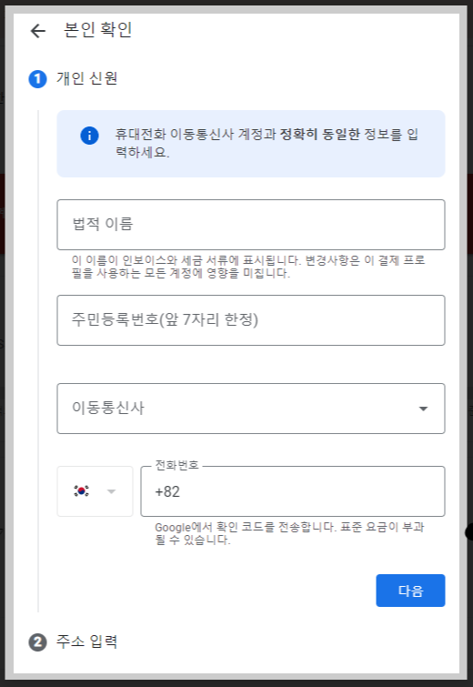 우리 평소 타 사이트 가입 시 인증번호 발송할 때 처럼 법적이름 한글로 정확히 잘 쓰시고, 주민번호 앞 7자리, 이동통신사 선택하고 전화번호를 입력한 후 다음을 누르면 주소 입력하는 창이 또 뜹니다. 이때 주소를 정확히 쓰셔야 해요. 우리가 애드센스 지급 본인확인 핀번호는 메일이나 문자가 아닌 우편으로 오니까요. 조금 아날로그틱 하죠?