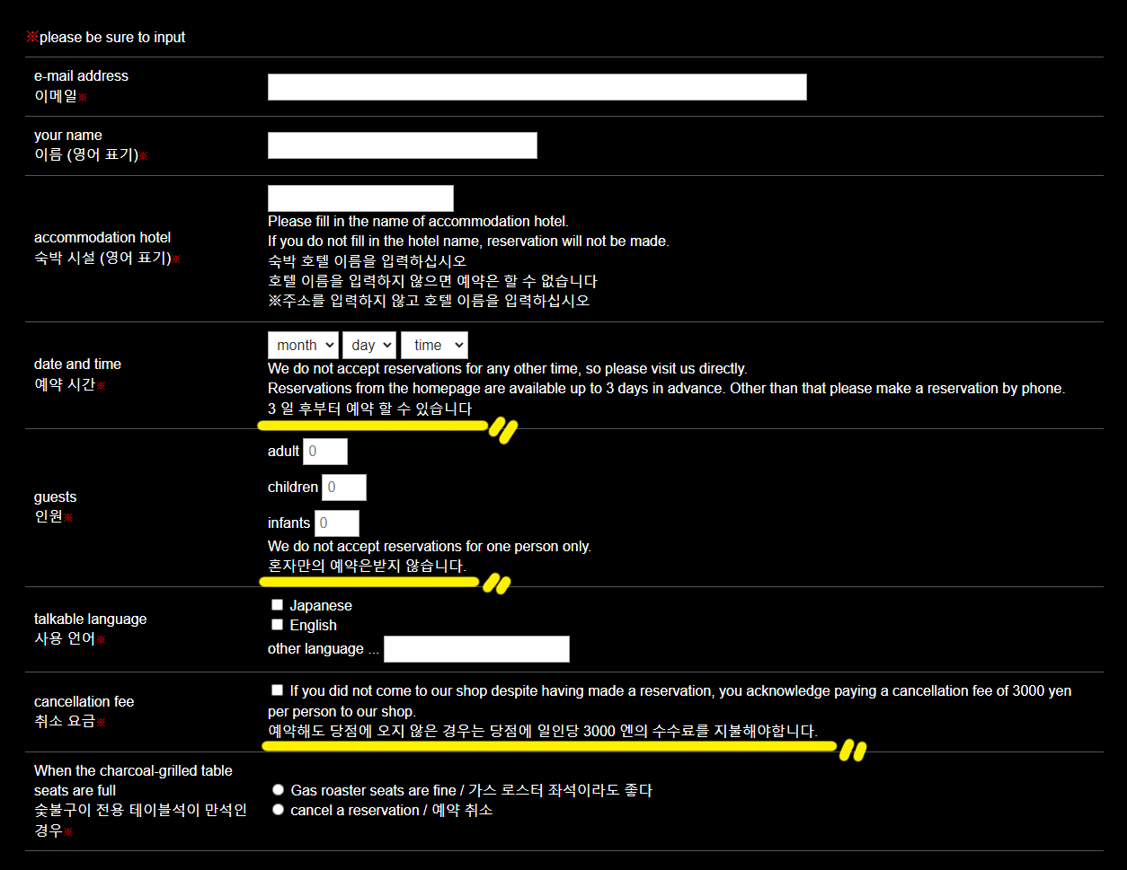 아래쪽 빨간 글씨로 한번 더 언급되어 있으니 반드시 확인하시고 예약해주세요. - 모두 입력하고 확인을 눌러야 하는데 일본어라 어느 쪽을 클릭할지 헷갈리겠지만