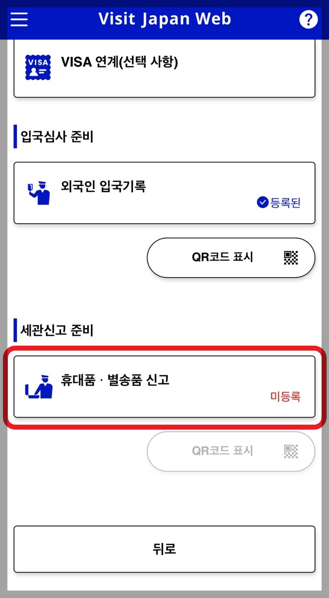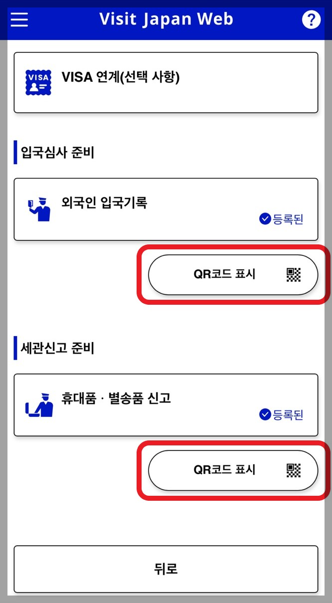 - 모든 등록을 완료하면 입국심사 준비와 세관신고 준비에 'QR코드 표시'가 활성화 됩니다.