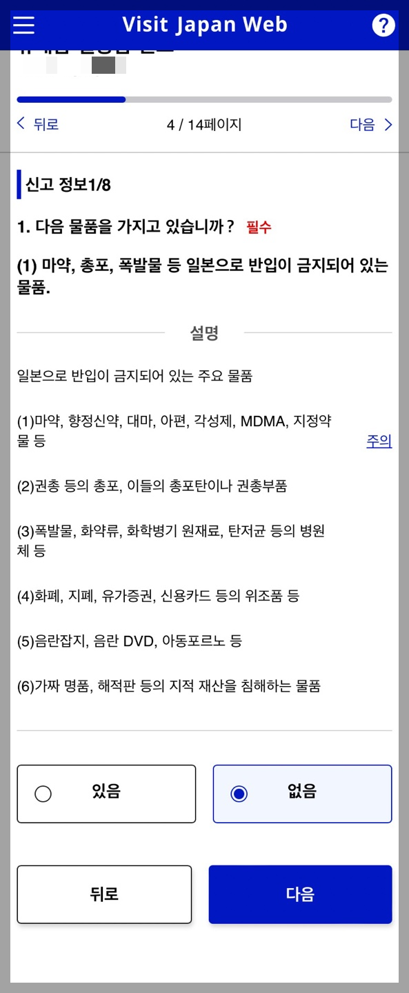 - 다음으로는 금지된 물품 및 별도 송부한 물품이 없는지 체크하는 내용이 8페이지에 걸쳐 나옵니다.