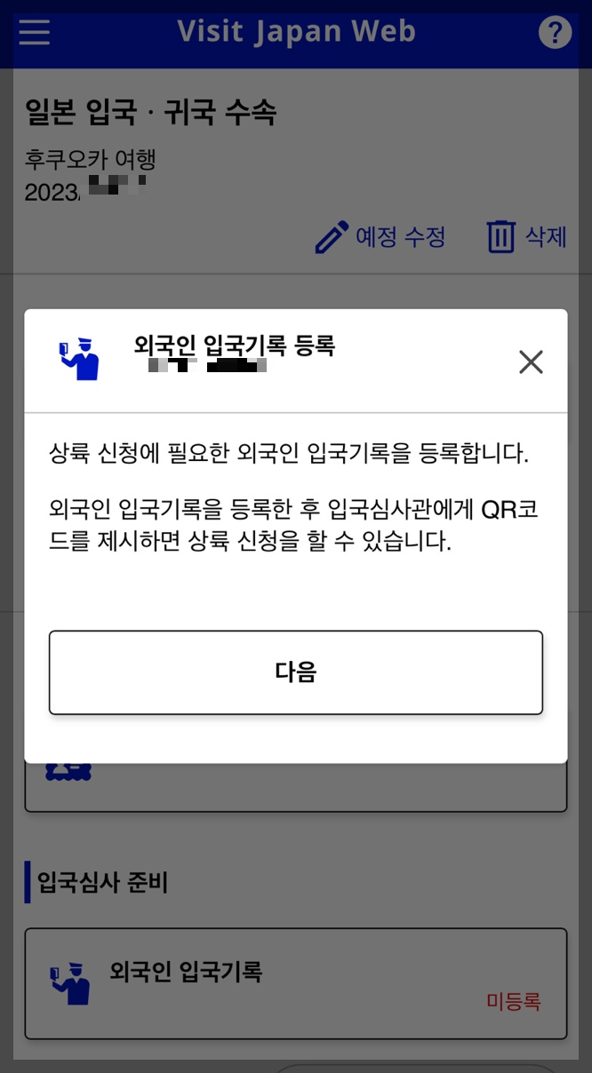 - 안내 팝업의 내용을 확인한 뒤 다음을 누르면 여권번호, 성명, 입국일자, 탑승편명 등 이미 입력해둔 내용이 반영되어 있습니다.