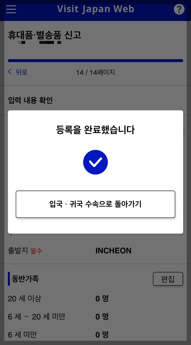 - 모든 등록을 완료한 뒤 다시 안내 팝업창의 '입국/귀국 수속으로 돌아가기'를 클릭합니다.