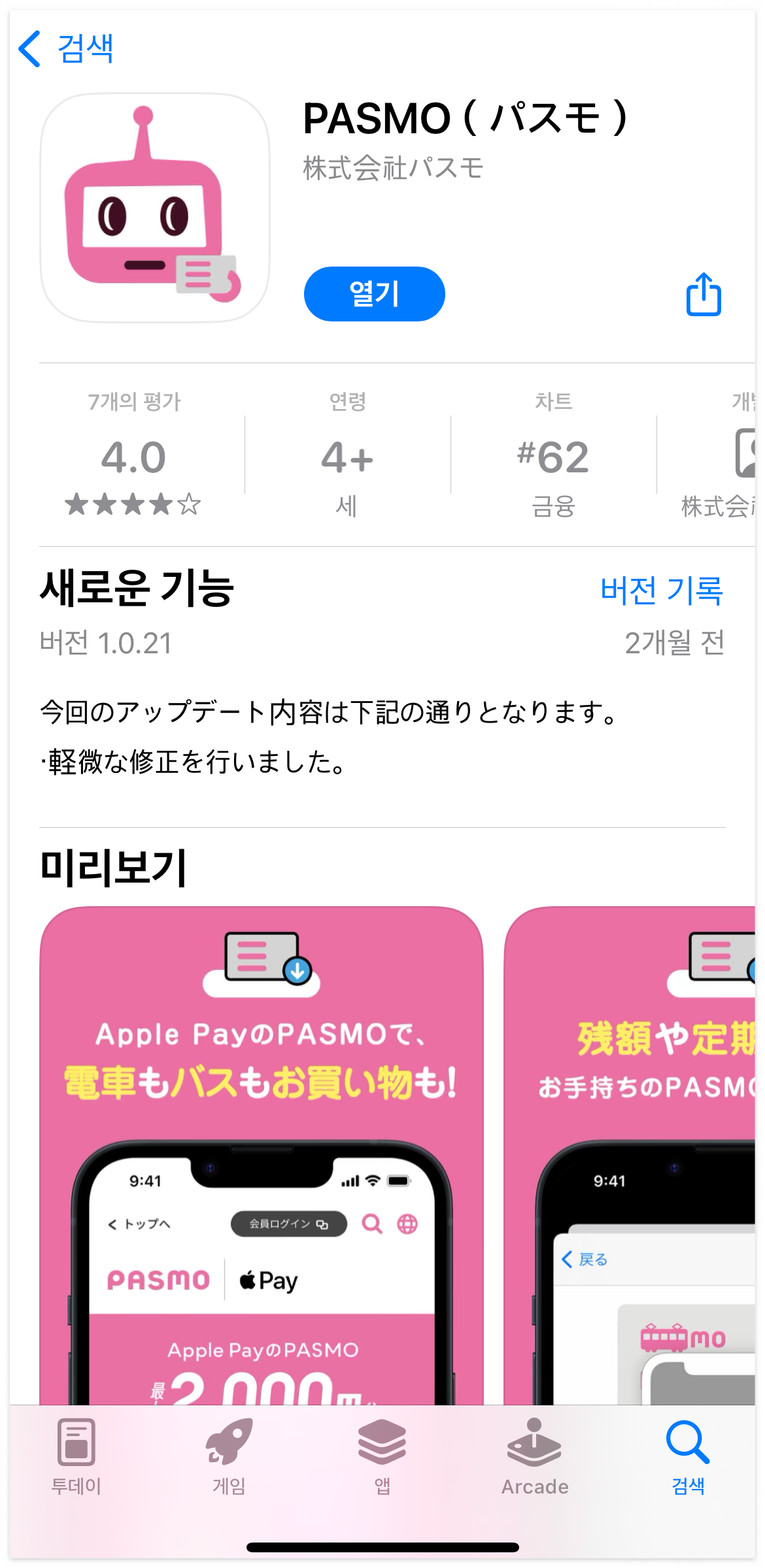 - 앱스토어에서 파스모를 검색하여 다운 받습니다.