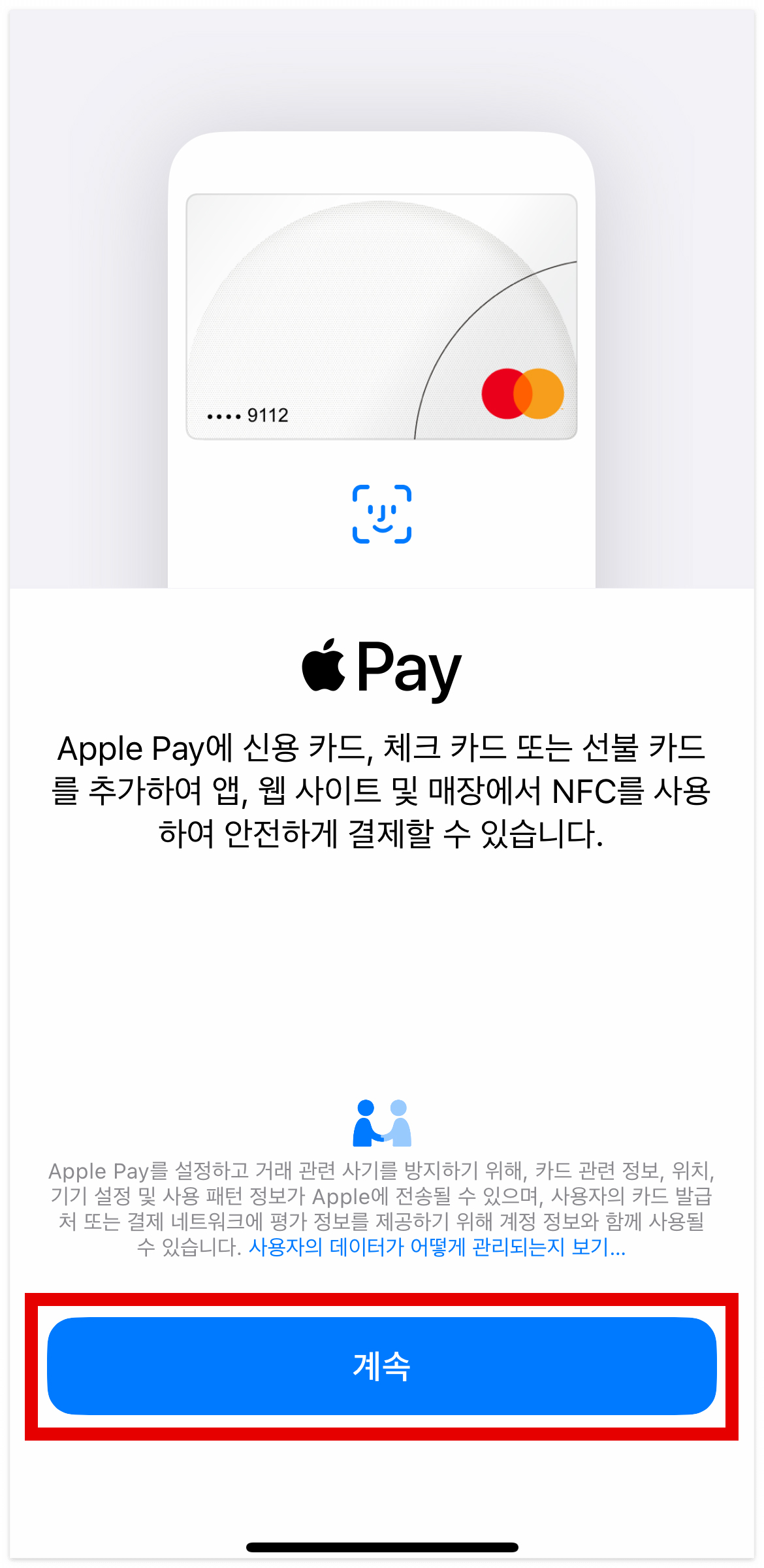 (※ 나중에 현지에서 현금을 넣어 충전하는 것입니다.) - 애플페이 안내문구가 뜨면 파란색 버튼 계속을 눌러주세요.