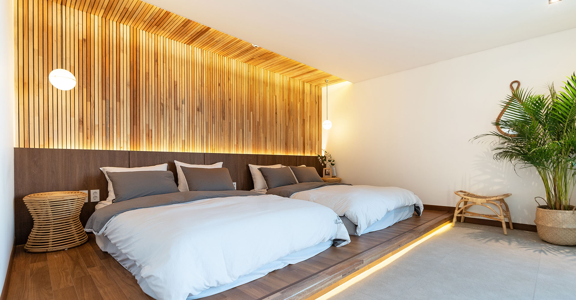 첫번째 숙소에서 숲을 보았다면, 지금 소개해드리는 곳은 함덕의 아름다운 바다를 볼 수 있는 오션뷰 숙소입니다. 이곳은 전 객실이 바다를 감상할 수 있습니다. 심플하면서도 아늑한 인테리어의 숙소가 마음의 편안함을 더해줍니다. 제가 묵은 곳은 제일 큰 객실이었는데요, 거실에 슈퍼싱글 두개를 이어 붙인 침대가 있고, 작은 방에는 더블사이즈의 침대가 있어서 최대 6명이 묵기 좋은 방이었습니다. 작은 방에는 시원한 창문과 하얀 커튼, 오션뷰가 어우러져 너무 예뻤습니다.