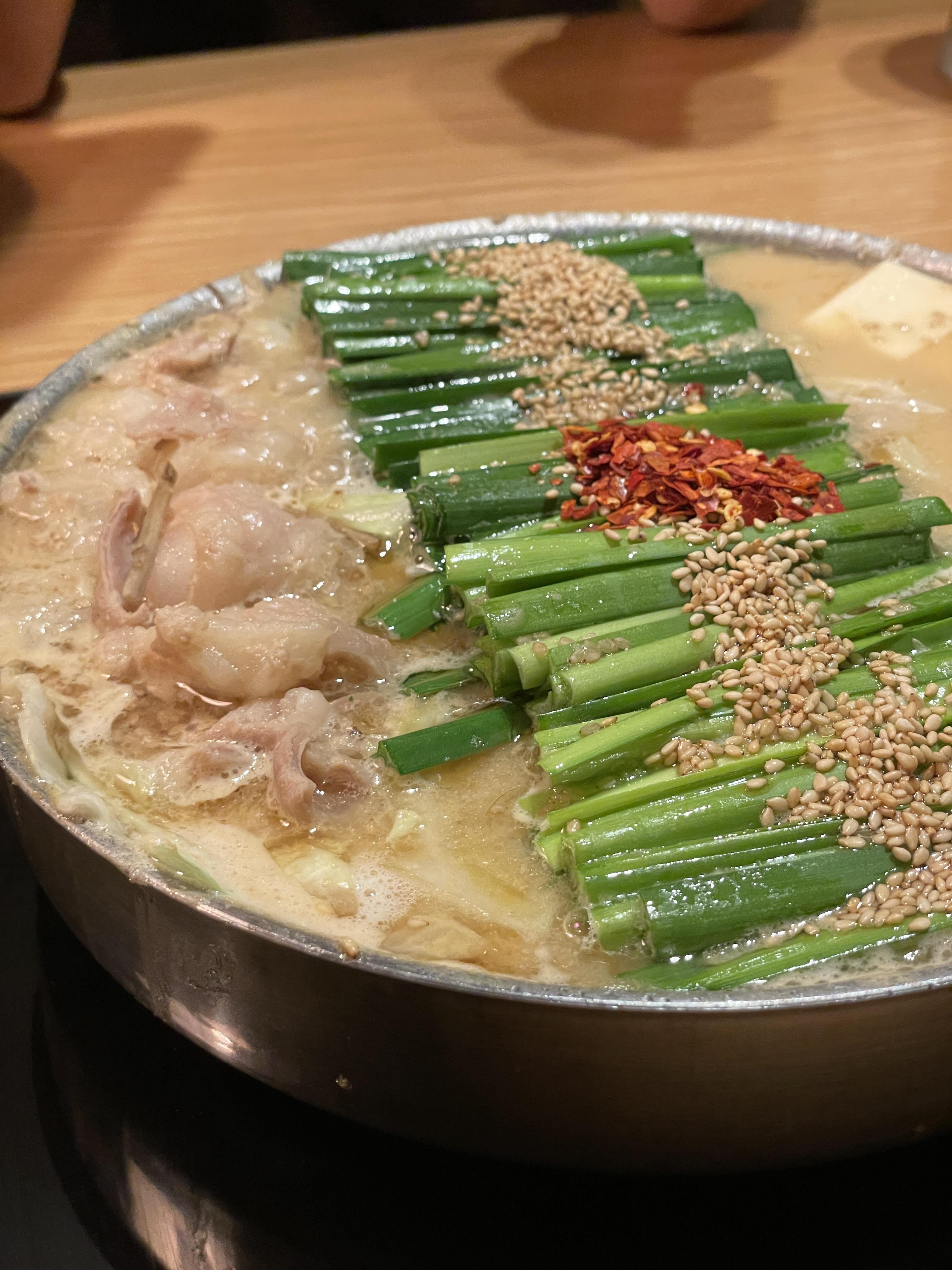 모츠나베 특유의 예쁘고 정갈한 데코레이션이 저는 너무 좋습니다. 길게 늘어선 부추 위에 깨와 고춧가루가 포인트가 되어 더 먹음직스럽게 보이네요.